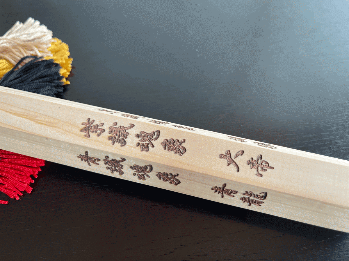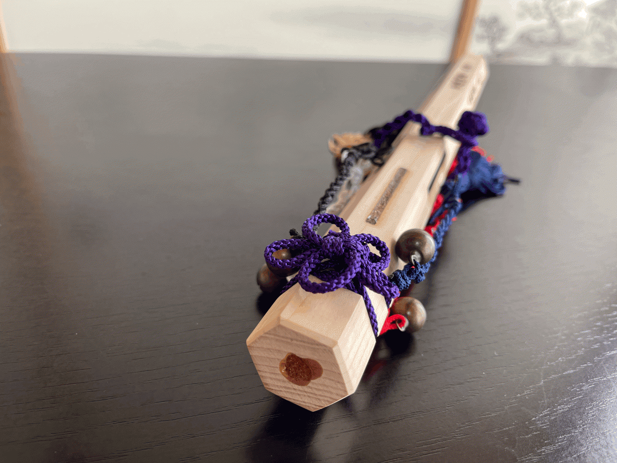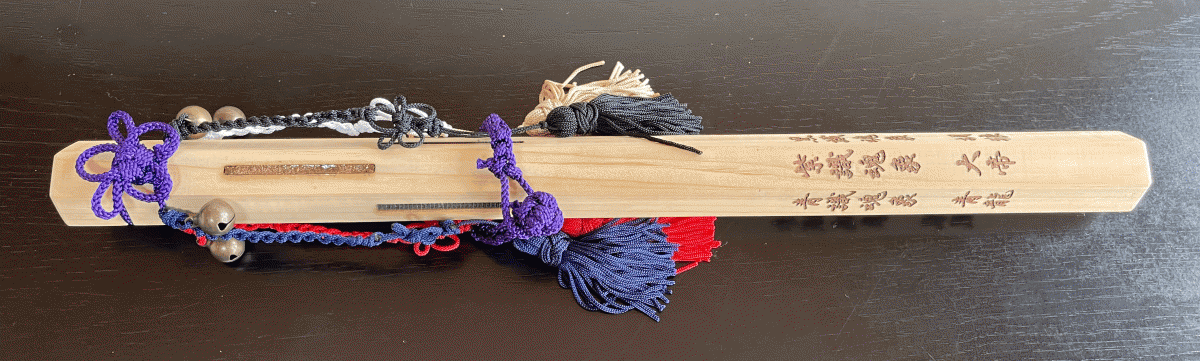 また、下部の留め紐を解くとすだれ房が下がり瑞葉(瑞葉の儀)と同様に破魔の水を付け、術や儀を執り行う事ができる法具となります。