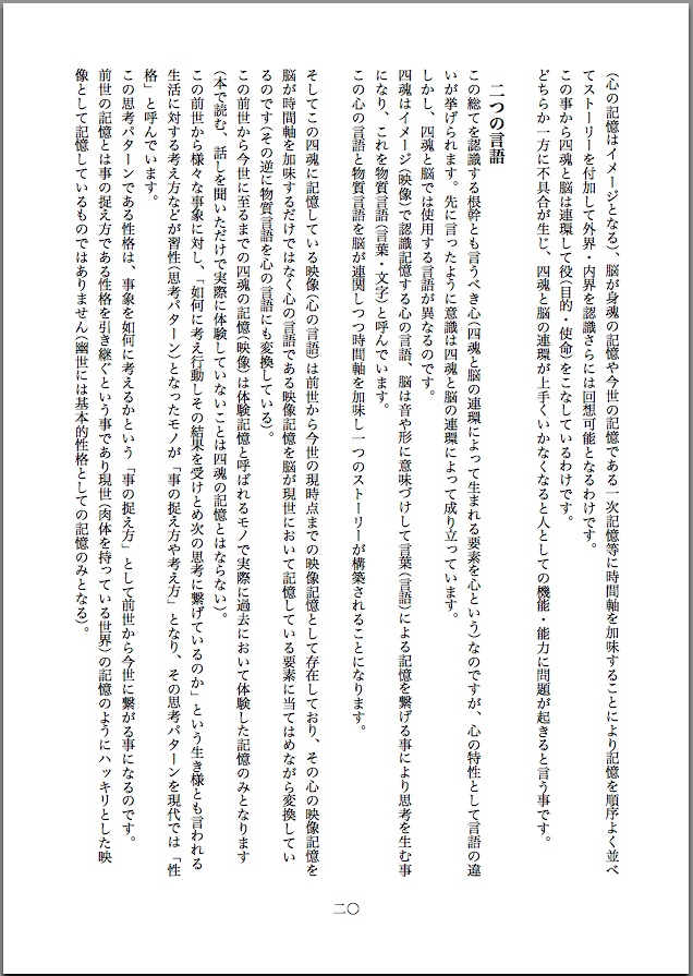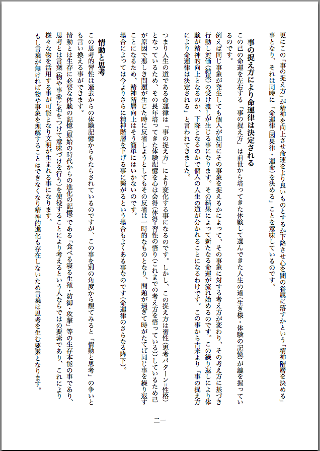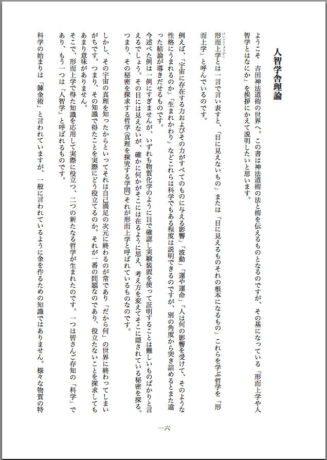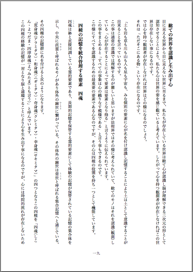 総ての世界を認識し生み出す心・四種の記憶を統合管理する要素 四魂・二つの言語・事の捉え方により命運律は決定される・情動と思考・心は四つの記憶から構成される・性格に基づき感情が変化する・法力を培う玄象法・法と術・根本理論の基・術法論・法の理 人体と心の理・人の構成・気(生命・活力)・生物は自動でプログラムを生み出す・変化と記憶・四魂の構成要素・四魂の働き(アラニタマ ニギミタマ クシミタマ サキミタマ)・法の理 神咒・理解できる言葉の連唱(連続して唱える)・放出部位への意識集中・言葉を聞く・術による気の動き・術法の事 基と専修・力の源泉 基事(基礎の意)・波動の影響 道を妨げるもの[ 外部波動 音(音波・音声波動) 映像波動 ]・自然波動(電磁波・音)・電磁波の影響.......等々